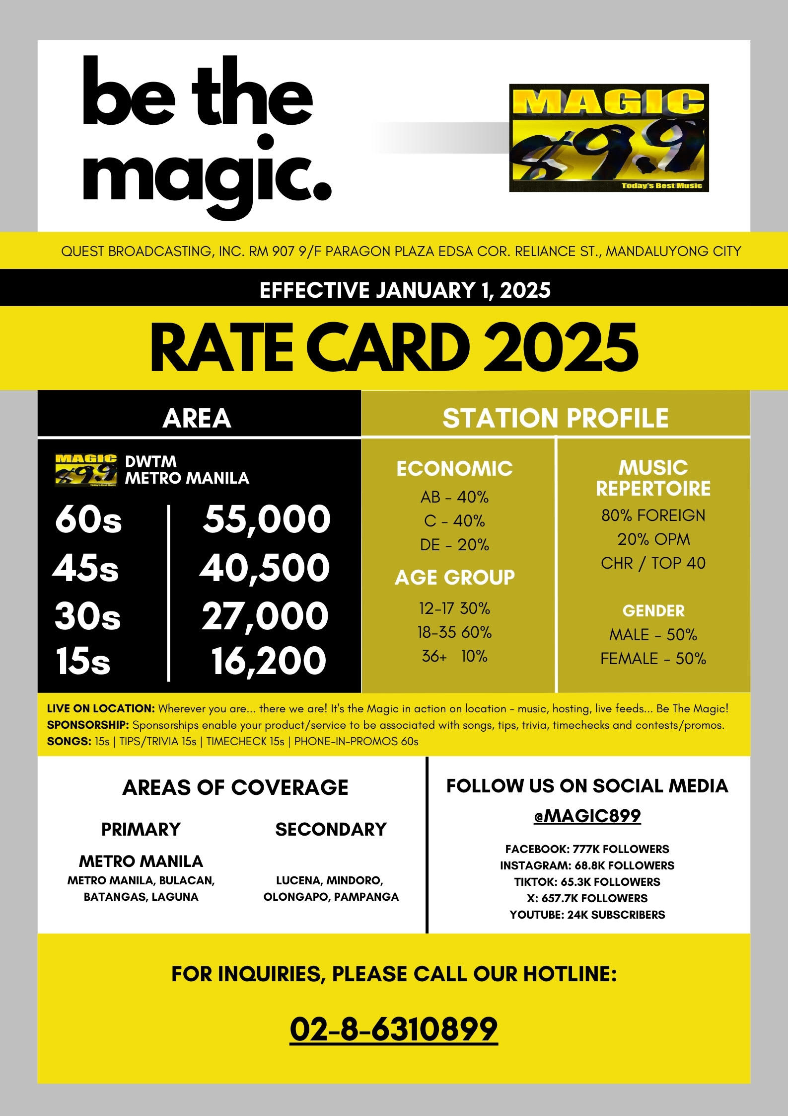 With its commitment to quality music, engaging shows, meaningful conversations, and digital innovation, Magic 89.9 FM continues to set the standard for modern radio in the Philippines—fresh, fearless, and always in tune with its listeners.